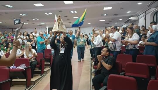 Padre GELCIMAR SOUSA SANTOS, diretor Espiritual Regional Norte II adentrando no plenário com a Imagem Peregrina de Nossa Senhora de Nazaré